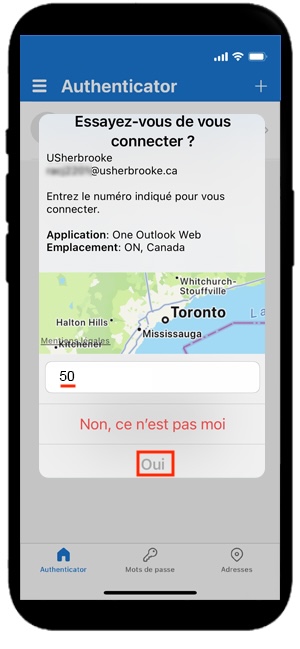 - déverrouillez l'application Microsoft Authenticator si nécessaire de la même façon que vous vous connectez à votre téléphone intelligent (code secret, Touch ID, Face ID, etc.);