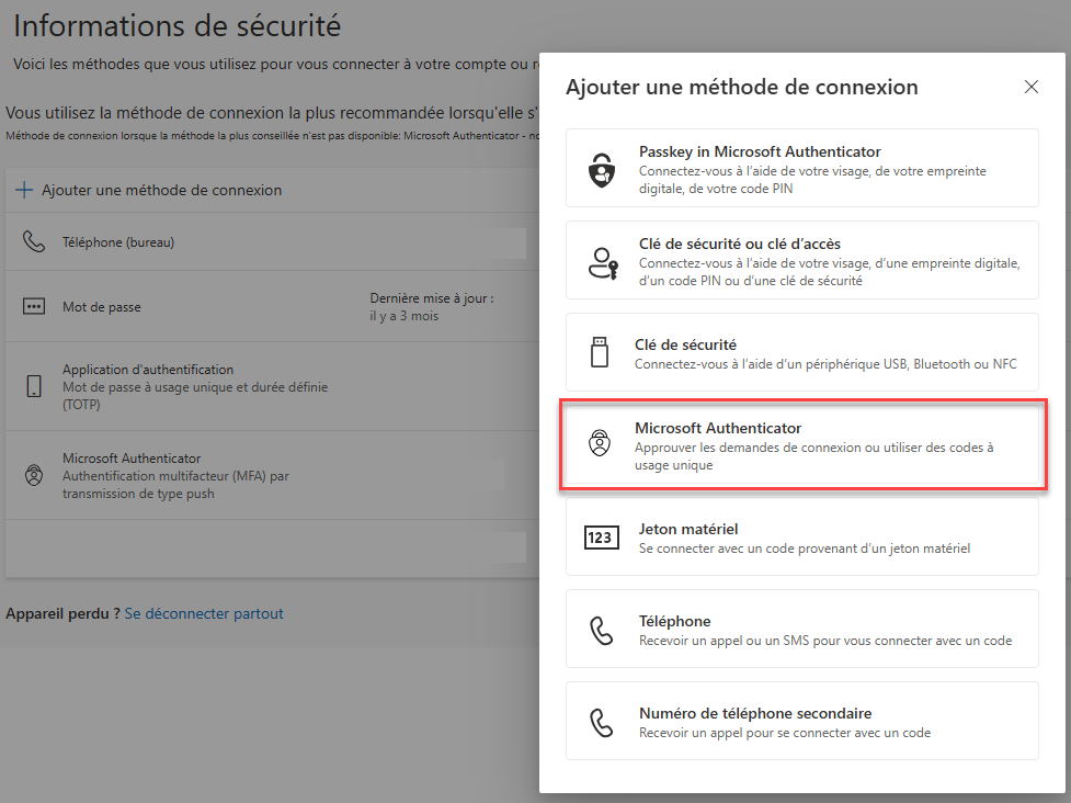 Il est recommandé de configurer le plus de méthodes de connexion possible, ainsi si vous n'avez pas accès à la méthode de vérification habituelle, vous pourrez en utiliser une autre. Pour savoir comment ajouter d'autre méthodes, consulter l'article Comment configurer et gérer mes méthodes de connexion?.