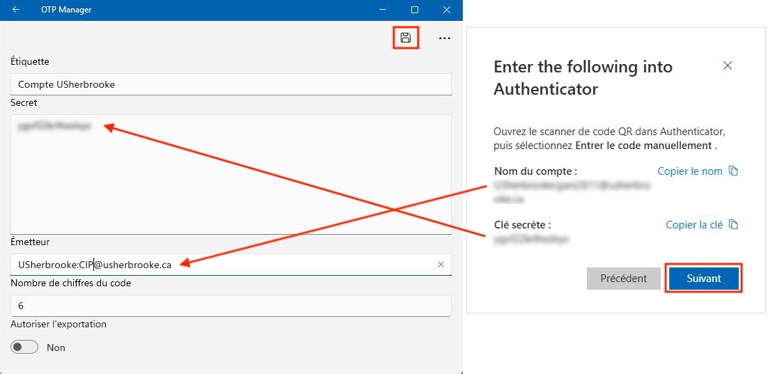 - Dans le champ Étiquette, entrez le nom de votre choix (ex. : Compte USherbrooke). Copiez et collez le Nom du compte affiché à l'étape 12 dans le champ Émetteur d'OTP Manager. Copiez et collez aussi la Clé secrète affichée à l'étape 12 dans le champ Secret d'OTP Manager en vous assurant d'enlever les espaces. Finalement, laissez le chiffre par défaut 6 dans le champ Nombre de chiffres du code et cliquez sur la disquette dans le coin supérieur droit pour enregistrer. Dans l'écran où se trouve le nom du compte et la clé secrète, cliquez sur le bouton Suivant.