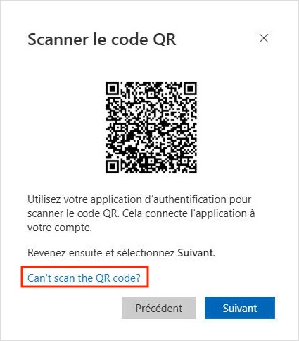 - Une fenêtre s'affichera avec un code QR, cliquez sur le bouton Can't scan the QR code?