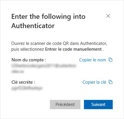 - Une fenêtre s'affichera avec un nom de compte et une clé secrète.