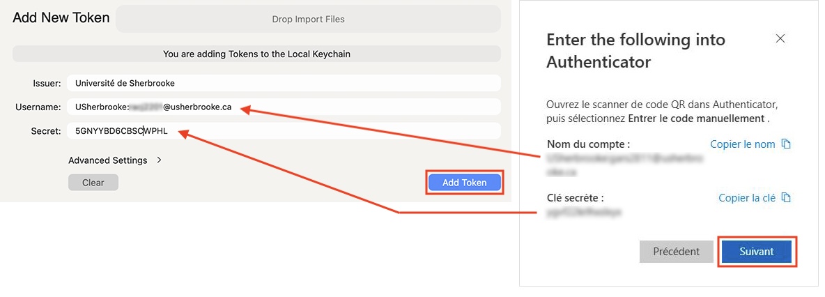 - Dans le champ Issuer entrez le nom de votre choix (ex. : Université de Sherbrooke). Copiez et collez le Nom du compte et la Clé secrète affichés à l'étape 8 dans les champs correspondants de OTP Manager (Username et Secret). Cliquez sur le bouton Add Token. Dans l'écran où se trouve le nom du compte et la clé secrète, cliquez sur le bouton Suivant.