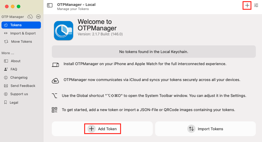 - Ouvrez l'application OTP Manager et cliquez sur le bouton Add Token ou le + dans le coin supérieur droit.